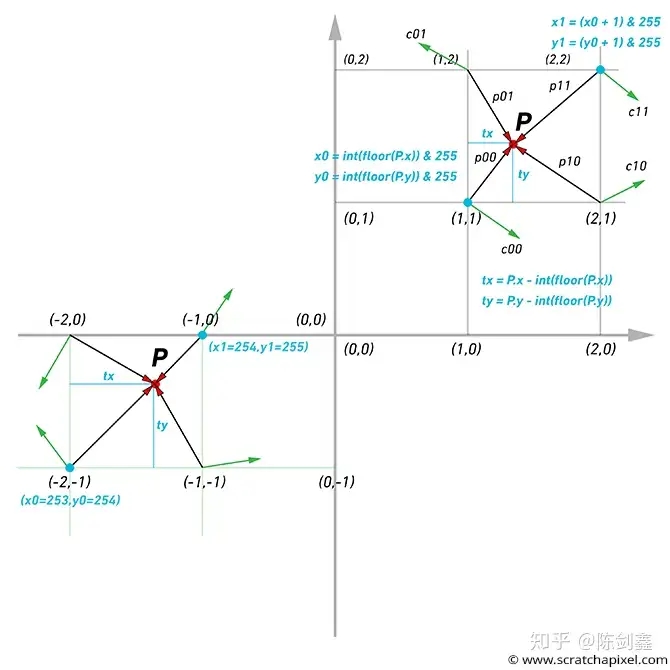 将坐标系划分成一块一块的晶格之后在晶格的每个顶点处生成一个随机的梯度(可以理解成方向向量),然后在计算噪声的时候会综合计算该噪声所在的晶格的顶点上的方向向量(图中绿色箭头)进行聚合计算(可以理解成加权计算合力)